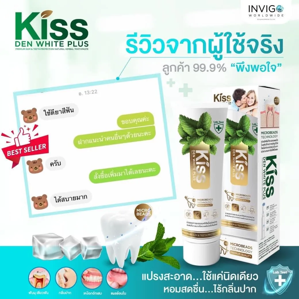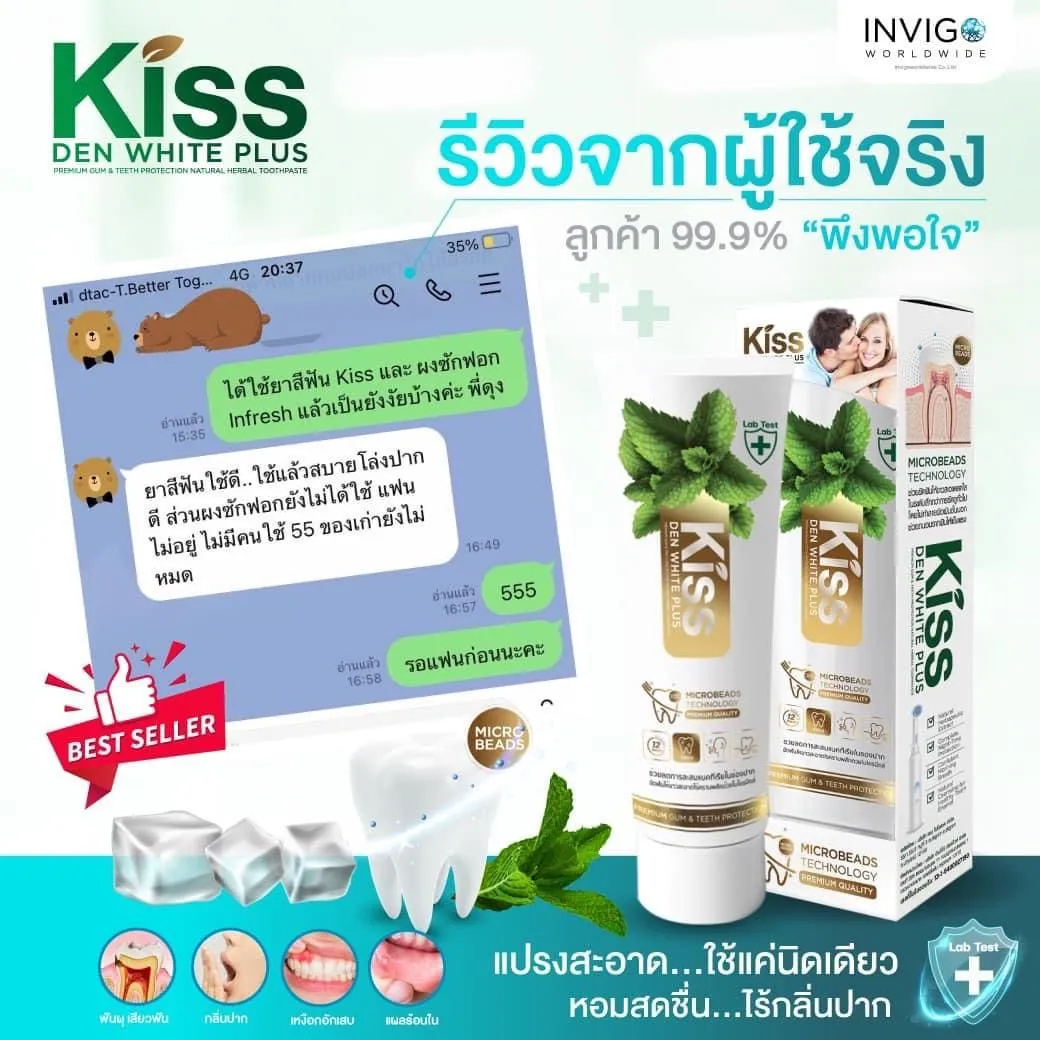 Kiss ยาสีฟันสำหรับผู้สูบบุหรี่ ยาสีฟันคราบกาแฟ ด้วยนวัตกรรมไมโครบีดส์ ช่วยขัดฟันให้ขาวใสอย่างอ่อนโยนโดยไม่ทำลายสารเคลือบฟัน ยาสีฟันที่ช่วยลดกลิ่นปาก เเละให้ลมหายใจสดชื่น สารสกัดธรรมชาติ สูตรเข้มข้นพิเศษ