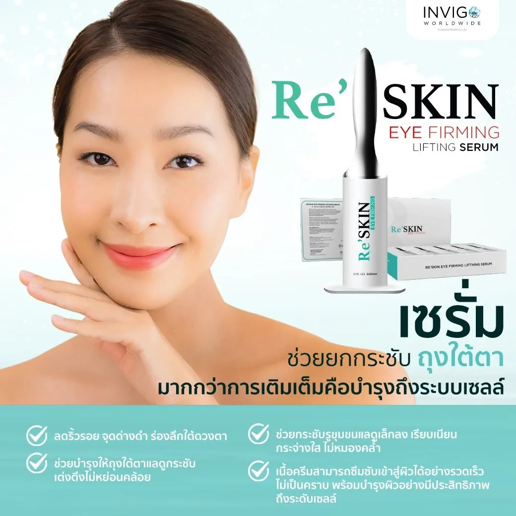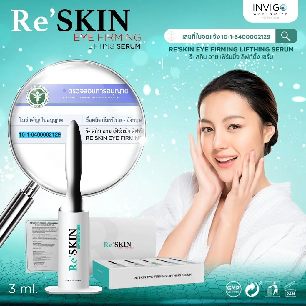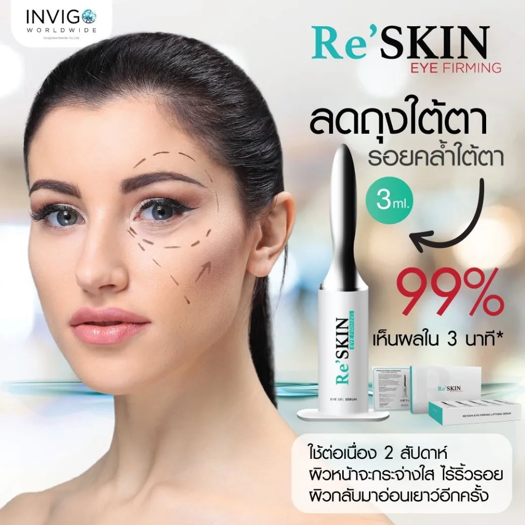 Re Skin 3ml. รี สกิน ครีมลดถุงใต้ตา ครีมลดริ้วรอย อาย เฟิร์มมิ่ง ลิฟท์ติ้ง เซรั่ม เซรั่มช่วยยกกระชับถุงใต้ตา รูขุมขนแลดูกระชับขึ้น ร่องหน้าผาก ริ้วรอย ร่องแก้ม แลดูตื้นขึ้น คงประสิทธิภาพนาน 6-8 ชั่วโมงส่วนผสมคิดค้นขึ้นเป็นพิเศษ เพื่อช่วยให้ผิวรอบดวงตาแลดูเนียนเรียบริ้วรอยต่างๆแลดูจางลงผิวแลดูชุ่มชื้นและสดใส