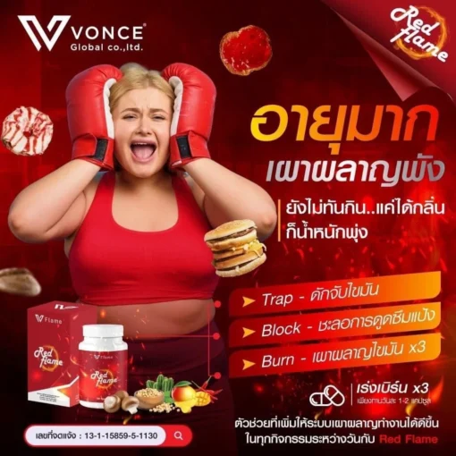 Red Flame VFlame จะทำให้เกิดการเผาผลาญได้มากขึ้นถึง 3 เท่า ดักจับไขมันจากอาหารที่ทานเข้าไปได้สูงถึง 80% พร้อมบล็อกแป้งและน้ำตาลส่วนเกินที่ร่างกายได้รับในแต่ละมื้ออาหาร ก่อนจะถูกเปลี่ยนสะสมไปเป็นไขมันจนยากที่จะเอาออกจากร่างกายด้วยเทคโนโลยีใหม่ที่ล้ำสมัย และสารสกัดใหม่ล่าสุดที่นำเข้ามา เพื่อจัดการน้ำหนักที่เห็นผลได้อย่างชัดเจน การจัดการน้ำหนัก และการมีสุขภาพที่ดีจากภายใน จะไม่ใช่เรื่องยากอีกต่อไป